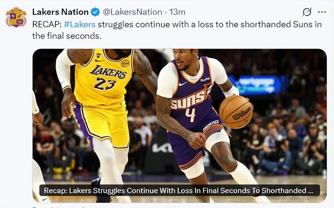 赛后湖人队也登上了全美第一热搜,一方面湖人已经遭遇三连败,他们距离附加赛只剩下1个胜场,另一方面湖人队已经连续两场比赛被准绝杀了。