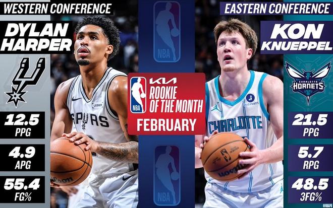 但弗拉格因脚伤在2月大部分时间缺阵,马刺后卫迪伦-哈珀成为本赛季首位非杜克系的月最佳新秀,斩获西部月最佳新秀。