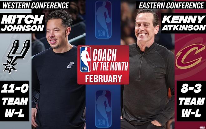 米奇-约翰逊率领马刺打出11胜0负的2月不败战绩,当选西部月最佳教练。阿特金森带领骑士打出8胜3负的2月战绩,当选东部月最佳教练。