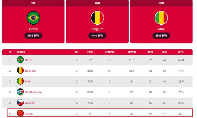 在A组的6支球队当中,中国女篮前两战的三分命中数和三分命中率都排名倒数第一。虽然中国女篮拥有世界级的内线——李月汝、韩旭和张子宇。但是中国女篮的三分球成为了非常严重的短板。