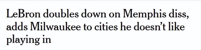 “密尔沃基我也说了啊,他们是没看见吗?没注意到吗?”詹姆斯表示,自己关于密尔沃基的言论并没有引发这么大反响,“我41岁了,目前就是有两座城市我不喜欢去打球,一个是密尔沃基,一个是孟菲斯。这有什么问题?”
