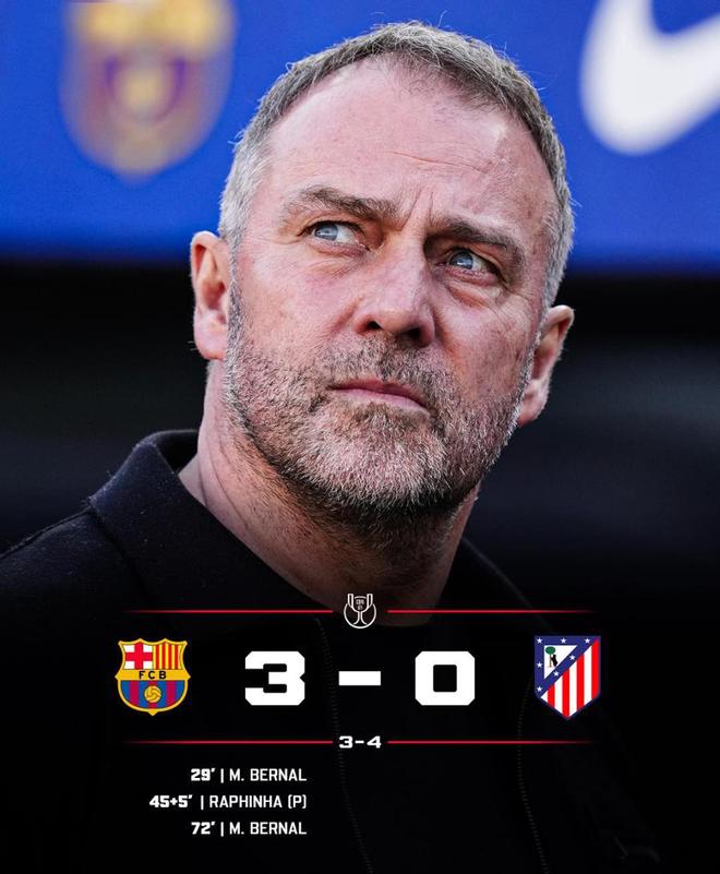 随后蓝红军团的攻势更猛,先是亚马尔在禁区内倒地,裁判没有给点;随后拉什福德回敲,赫拉德-马丁怒射擦横梁而出,最终比分定格在巴萨3-0马竞,蓝红军团虽赢下比赛,却输掉系列赛。总比分3-4,止步半决赛,卫冕梦想破灭。