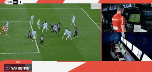 第70分钟,主裁判叫停比赛,VAR介入,慢镜头显示韦特格拉在本方禁区内明显手球,但琼阿梅尼有一个推人的动作,裁判示意没有点球。