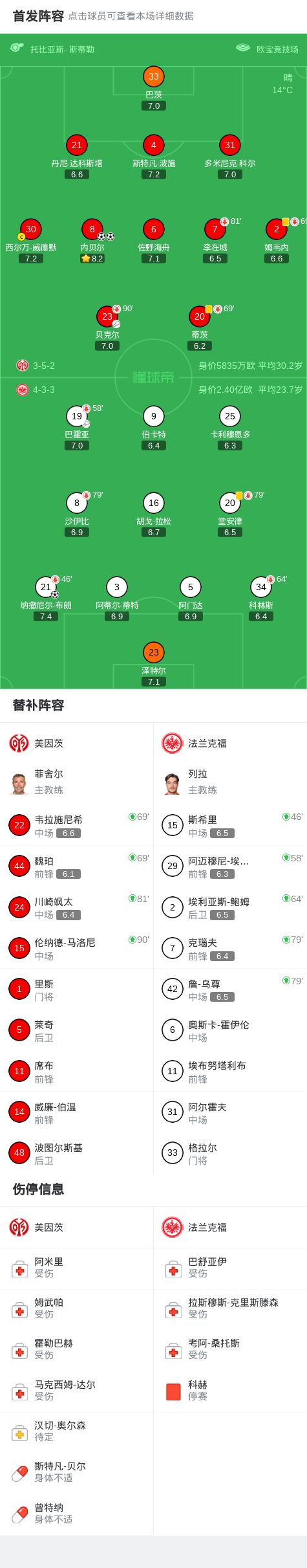 第20分钟,法兰克福球员巴霍亚助攻纳撒尼尔-布朗打入一球。